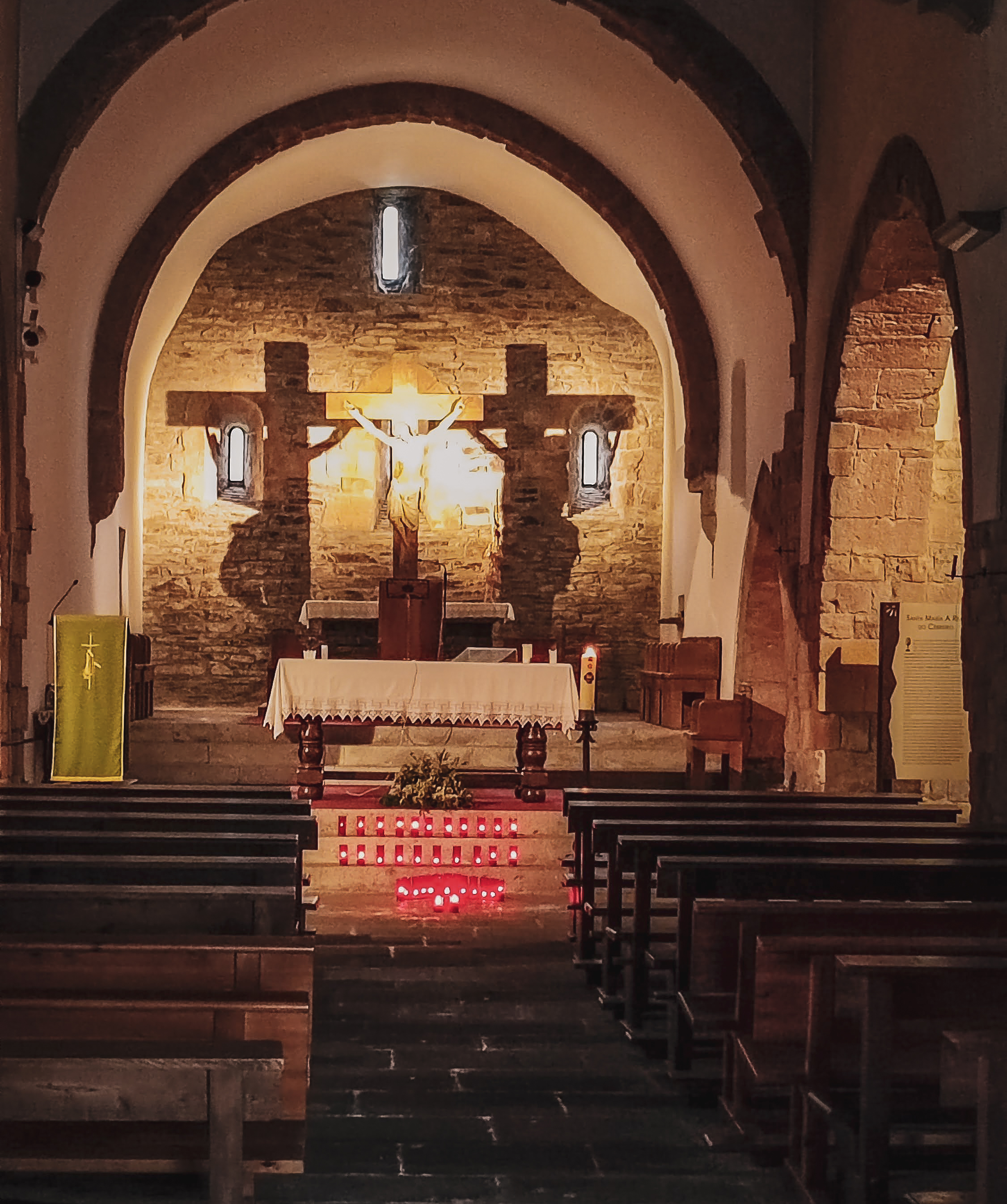 Sanktuarium Matki Bożej w O’Cebreiro to wciąż skromna, romańska świątynia, z kamiennym portalem i surowym wnętrzem. Jej prostota oddaje ducha pokuty i skupienia, który towarzyszy pielgrzymom na Camino.